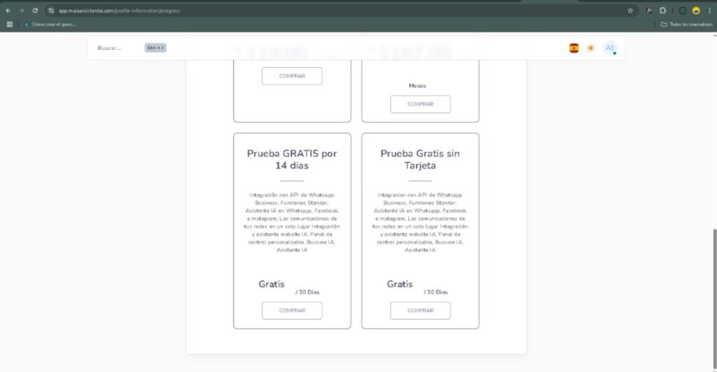 Puede optar por alguna suscripción mensual o anual, o comenzar a usar una prueba de 14 dias completamente gratis.