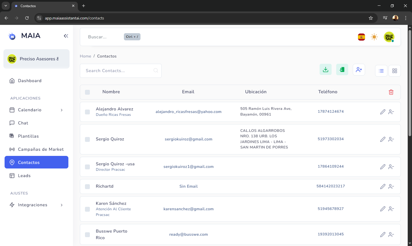 Desde esta sección puedes visualizar, editar, clasificar y exportar todos los contactos registrados en tu sistema Maia, incluyendo leads, clientes y prospectos.
